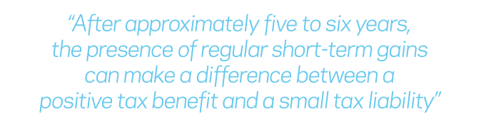 Second, as time progresses, after approximately five to six years, the presence of regular short-term gains can make a difference between a positive tax benefit and a small tax liability. 3 3 Close A direct indexing strategy builds up unrealized gains due to the deferral of gains in earlier years. While this is generally beneficial for an investor, a consequence is that after a few years, rebalancing the strategy (e.g., to stay within a certain tracking error of the index) may cause the strategy to realize more gains than losses and result in a tax liability rather than a tax benefit. While many investors familiar with direct indexing strategies expect their tax benefits to decay over time and to be generally lower in the absence of short-term gains from other investments, Figure 1 shows just how striking the impact is.