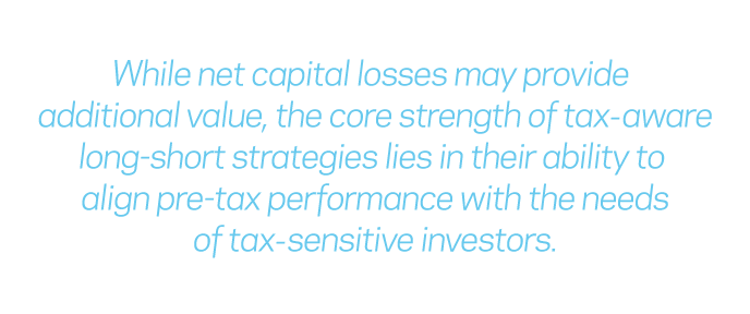 To come full circle, while net capital losses may provide additional value, 6 6 Close As shown, e.g., in Liberman and Sosner (2024), some investors might find interesting applications for the net capital losses realized by tax-aware long-short factor strategies (achieved primarily by slowing unnecessary gain realization). However, the core value proposition of these strategies is their ability to deliver pre-tax alpha of a top-tier institutional asset manager to taxable investors. the core strength of tax-aware long-short strategies lies in their ability to align pre-tax performance with the needs of tax-sensitive investors. As this approach to managing factor strategies gains traction and becomes available to a larger universe of investors, we remain as committed as ever to advancing research on its benefits and applications.