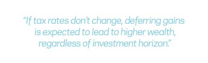 The results are clear. If tax rates don’t change, deferring gains is expected to lead to higher wealth, regardless of investment horizon – and like any edge in investing, this result becomes more and more powerful the longer you go.